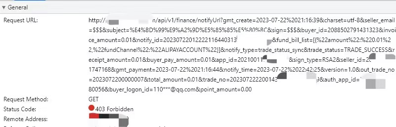 联系支付宝客服反馈问题,支付宝客服表示每笔订单均回调5次,但收到的是状态码为403的响应,未收到200-success响应,并提供了通知报文url。